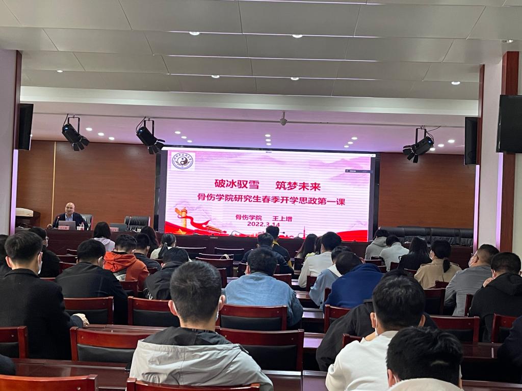 本网讯(文图/韩小飞)为深入学习习近平新时代中国特色社会主义思想,贯彻落实省委高校工委、省教育厅的通知要求及校党办《关于上好2022年春季开学思政第一课的通知》要求,结合我校常态化疫情防控要求,经周密安排、精心准备,骨伤学院于2022年3月14日在东风路校区一楼会议室举办春季“开学思政第一课”,骨伤学院副院长王上增以《破冰驭雪 筑梦未来》为题,以线上线下相结合的方式为研究生进行授课,骨伤学院全体研究生参加了本次学习。