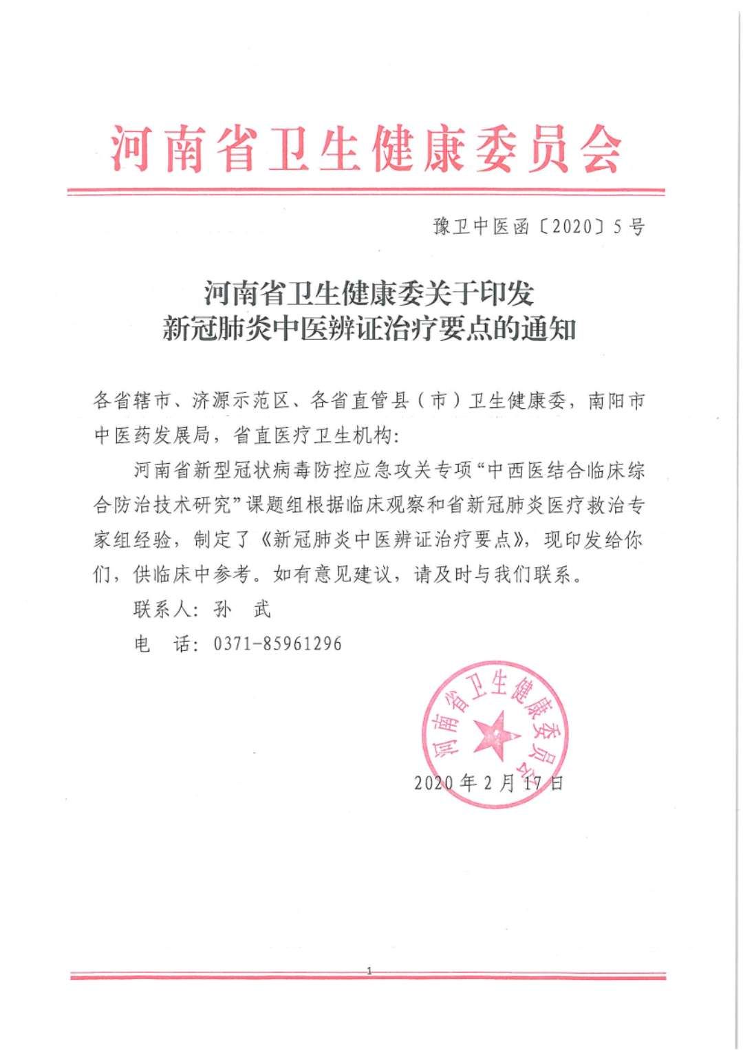 河南省卫健委关于新冠肺炎中医辨证治疗要点的通知