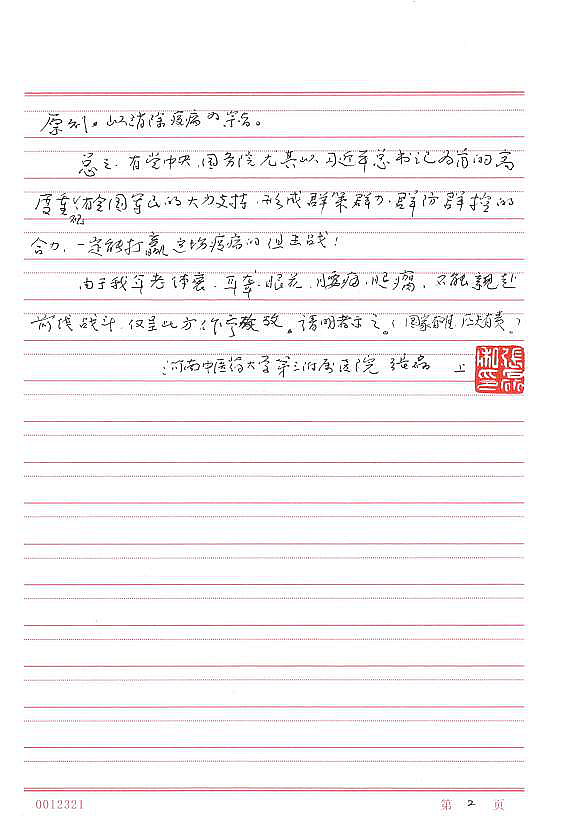悠悠为民情,拳拳爱国心。张磊老师表示,新冠肺炎发病急、传染快、死亡率高,要以“中西医结合”治疗为好,不要各呈其强,延误病情,充分体现了张磊老师仁心仁术、实事求是的严谨医风。他特别提到,由于自己年老体衰、耳聋眼花、腰痛腿瘸,不能亲赴前线战斗,仅呈此方作参考,体现了张老师为国担难、为民尽责的大医担当和鲜明品格。