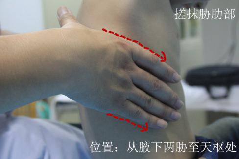 操作:以两掌贴合皮肤从两侧腋下搓摩至肚脐水平线,手腕放松,且忌用暴力,操作6-9遍。